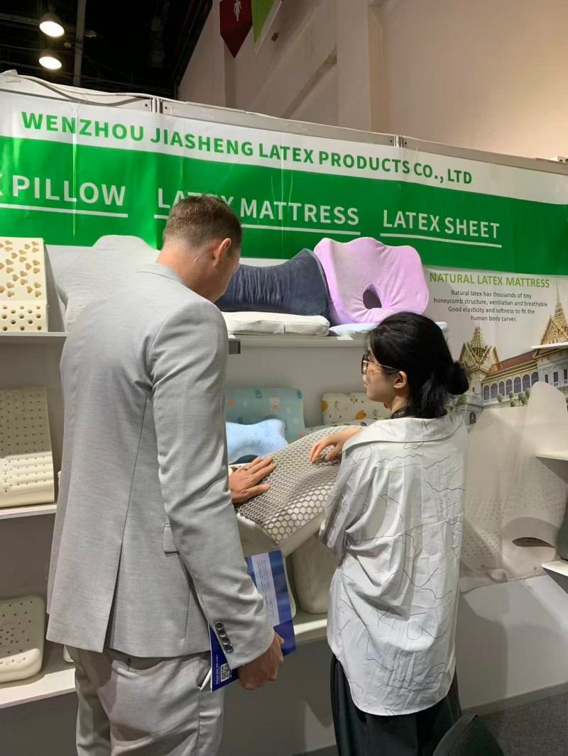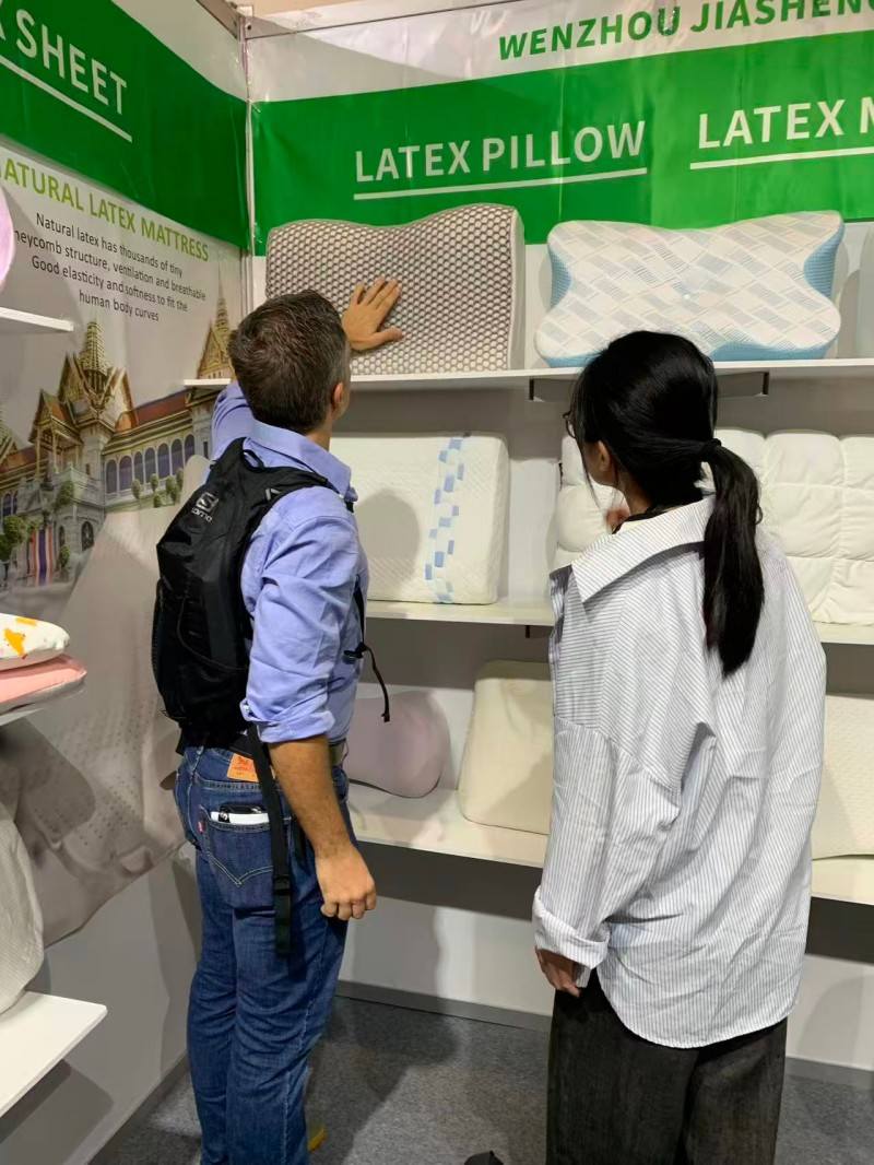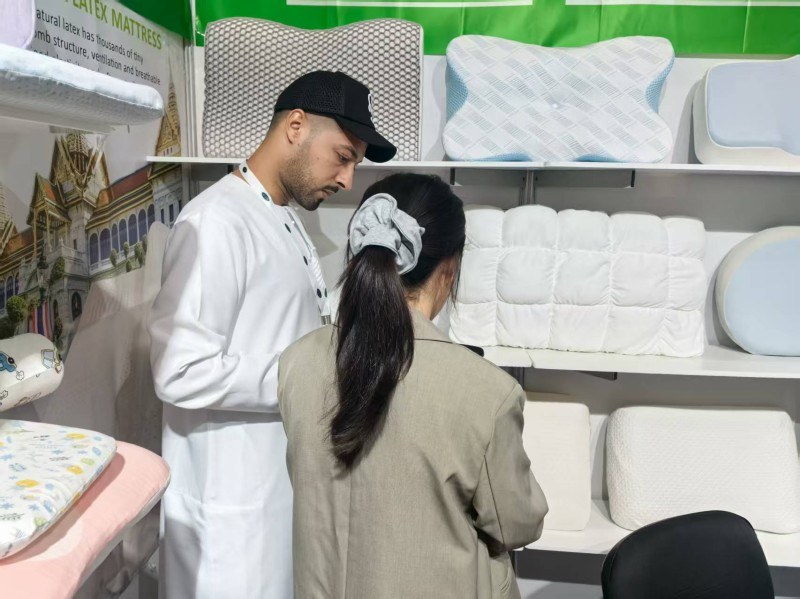 На цій виставці сну в Дубаї ми маємо честь показати наші подушки для сну відвідувачам з усього світу. Ми прагнемо представити дві найпопулярніші подушки на ринку:подушка з натурального латексуі сучасний розумний матеріалподушка з піни пам'яті. Швидке відновлення та антиалергічні властивості латексу дуже подобаються любителям латексу. Між тим, ідеальне прилягання піни з ефектом пам’яті може забезпечити глибокий сон. Наше поглиблене спілкування з клієнтами на місці змусило нас відчути їхню гонитву за подушками. Ми твердо переконані, що надання індивідуального вибору для різних звичок сну є ключем до якісного сну.
